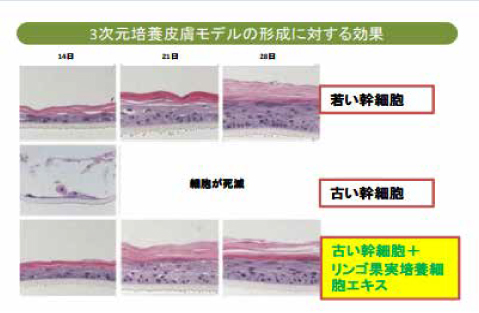 写真は、「若い幹細胞」と「古い幹細胞」と「古い幹細胞+リンゴ果実培養細胞エキス」により3次元的に表皮をつくりだせるかの実験を行ったものです。古い表皮幹細胞は、細胞の能力を失い、死滅しまっています。