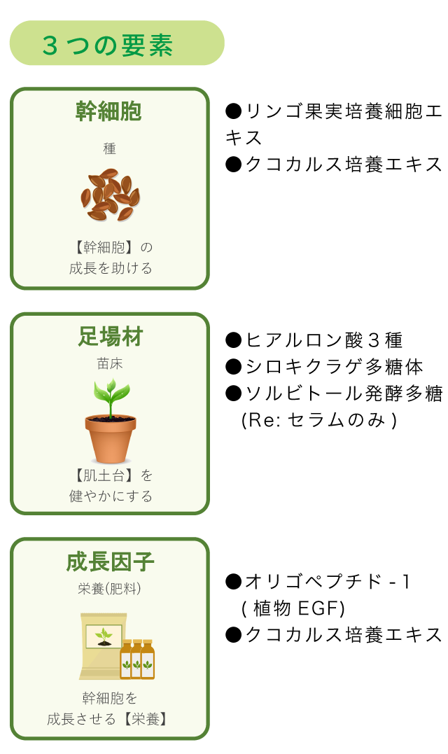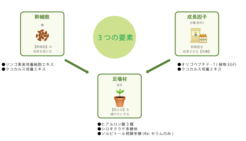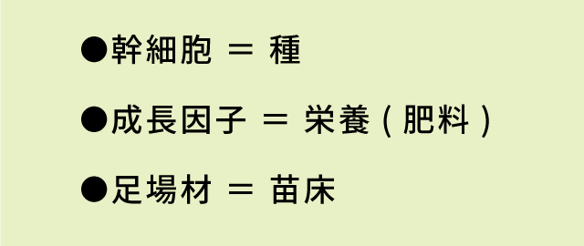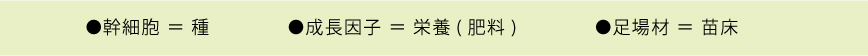 細胞(種)の成長を成長因子(肥料)が促進し、そのための土台として足場材(苗床)が必要となります。